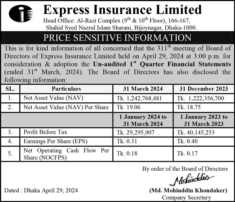 Price Sensitive Information of Express Insurance Limited