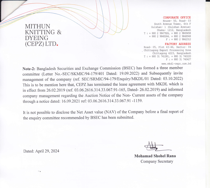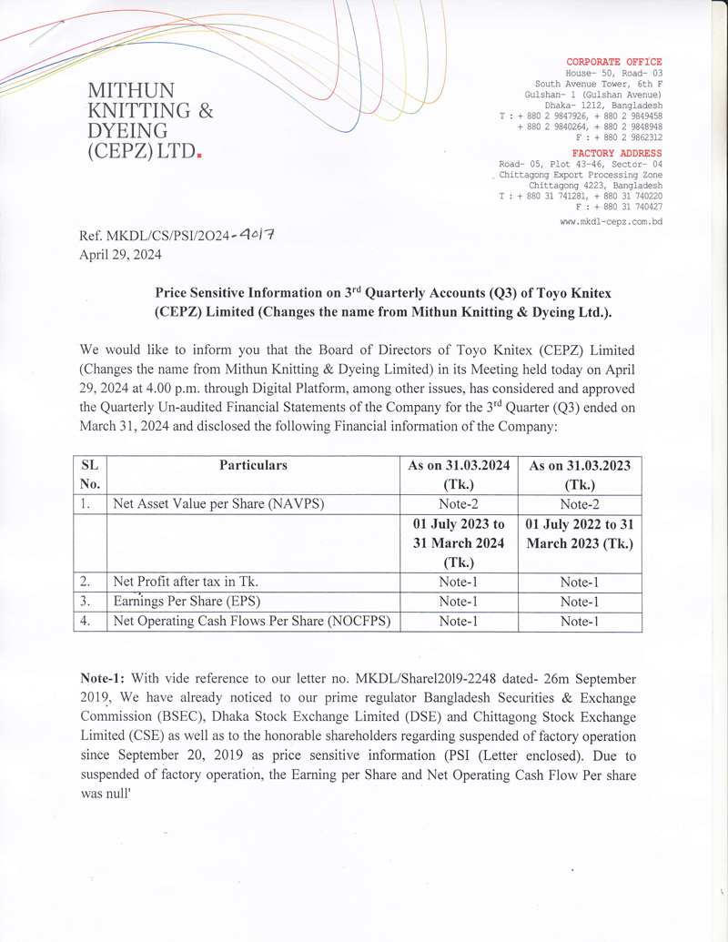Price Sensitive Information of Mithun Knitting & Dyeing (CEPZ) Ltd.