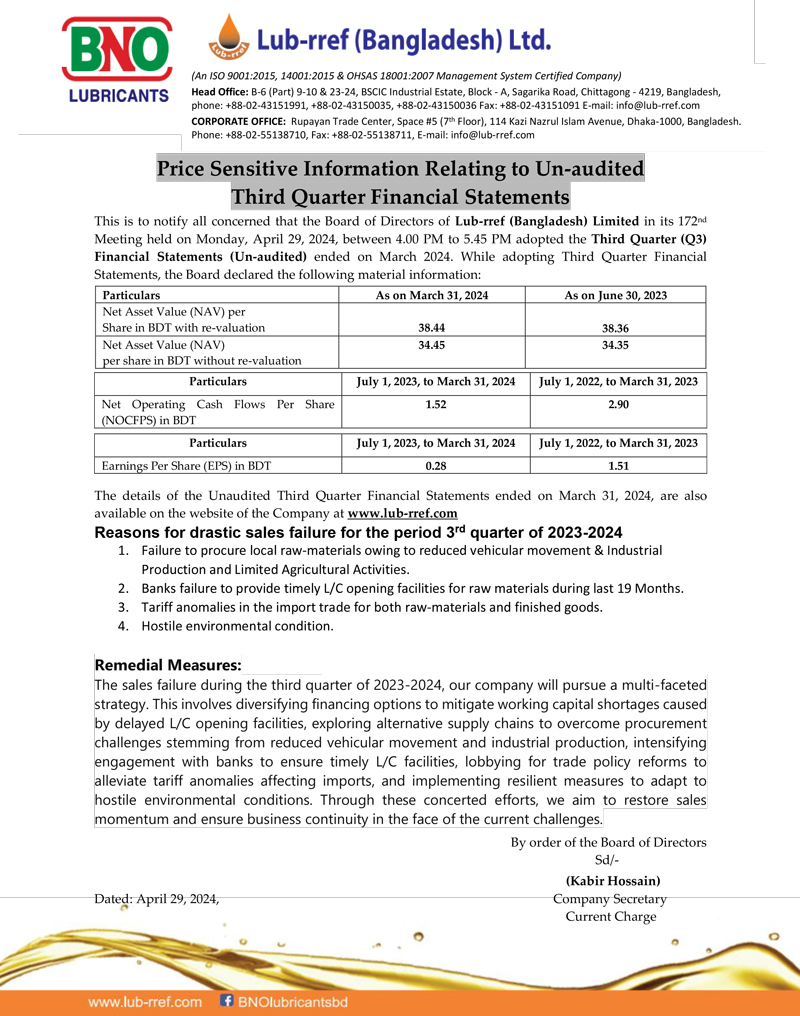 Price Sensitive Information (Q3) of Lub-rref (Bangladesh) Ltd.