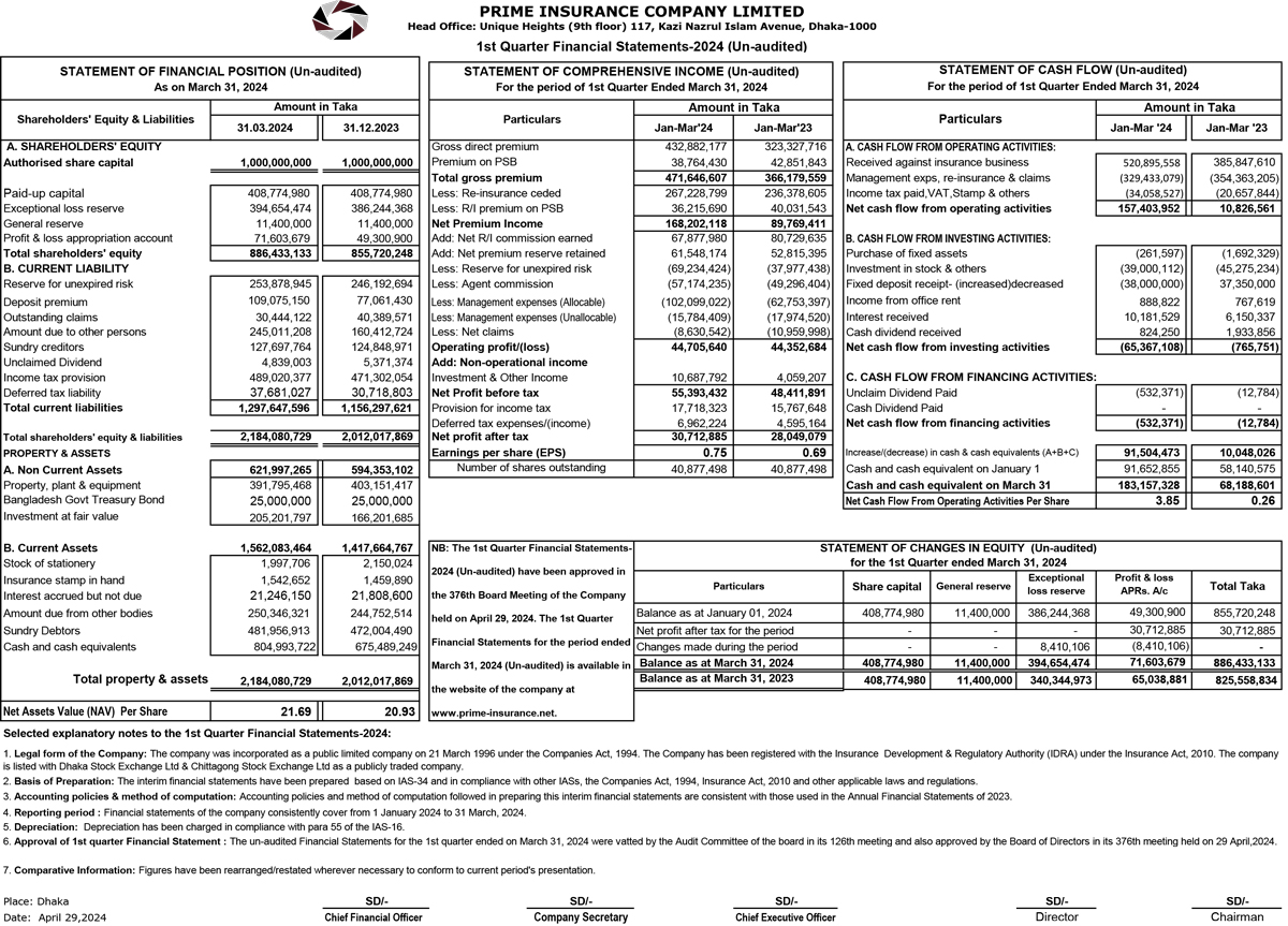 Q1 Un-audited Financial Statements of Prime Insurance Company Limited