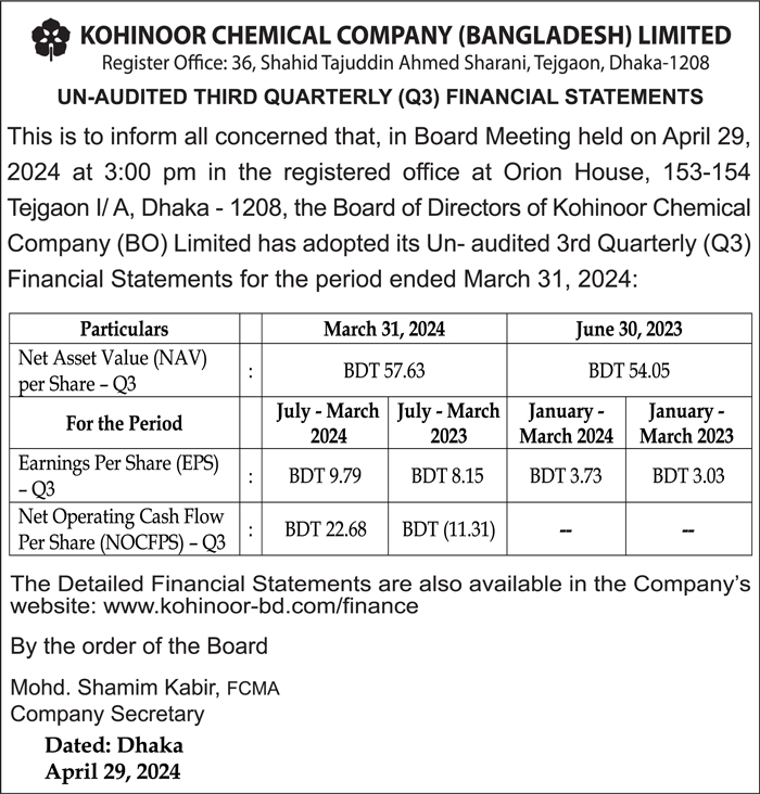 Q3 Un-audited Financial Statements of Kohinoor Chemicals Company (Bangladesh) Limited