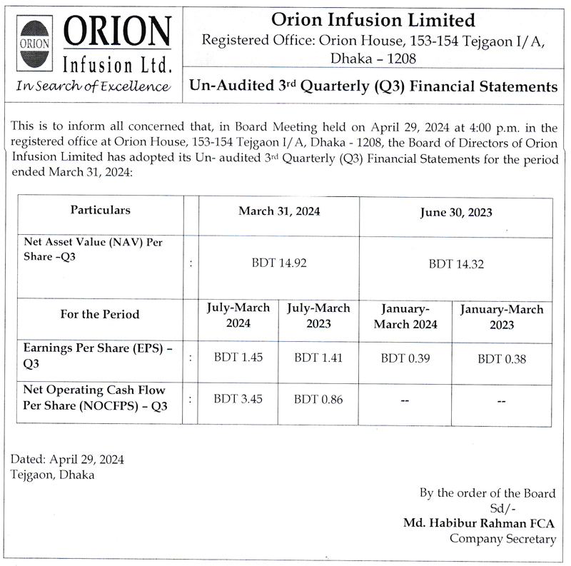 Q3 Un-audited Financial Statements of Orion Infusion Ltd