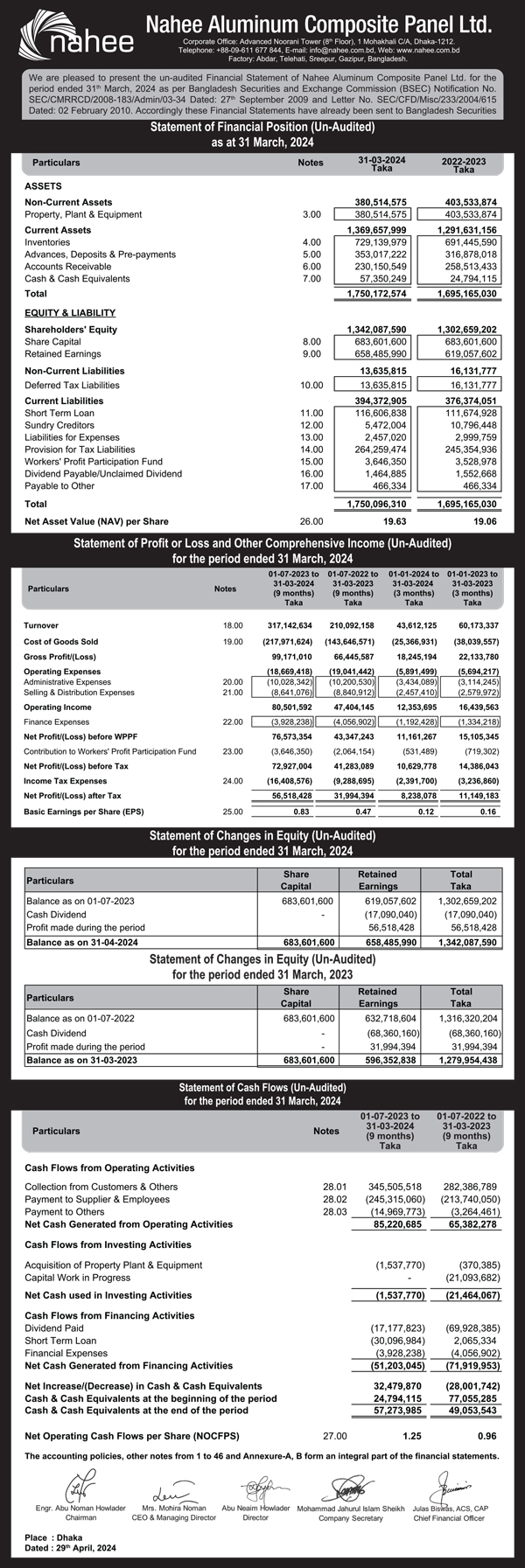 Statement of Financial Position (Un-audited) of Nahee Aluminum Composite Panel Ltd.