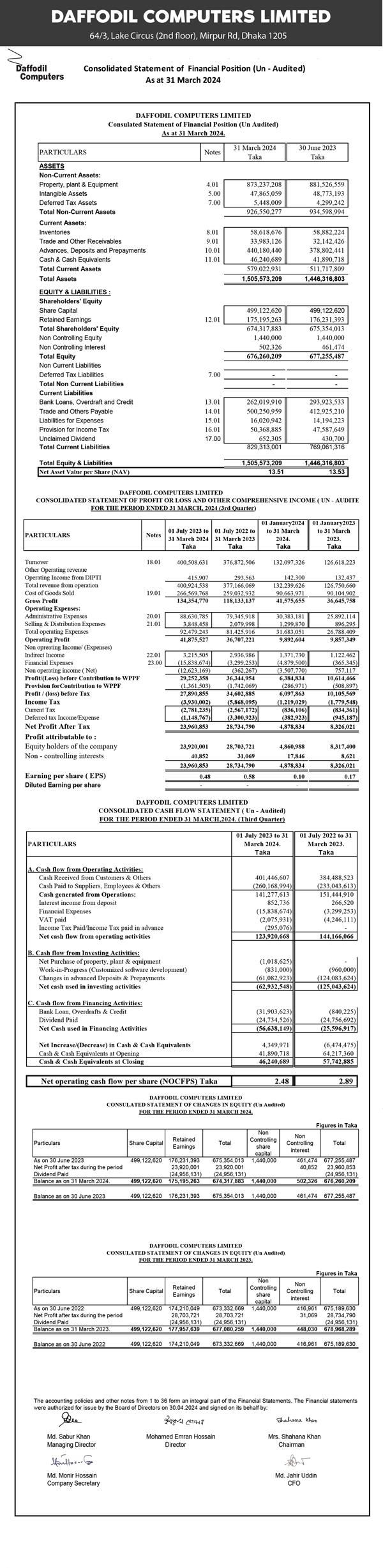 Consolidated Statements of Financial ( Un-audited) of Daffodil Computers Ltd.