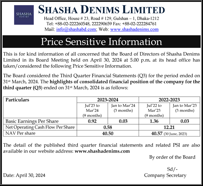 Price Sensitive Informaiton of Shasha Denims Limited