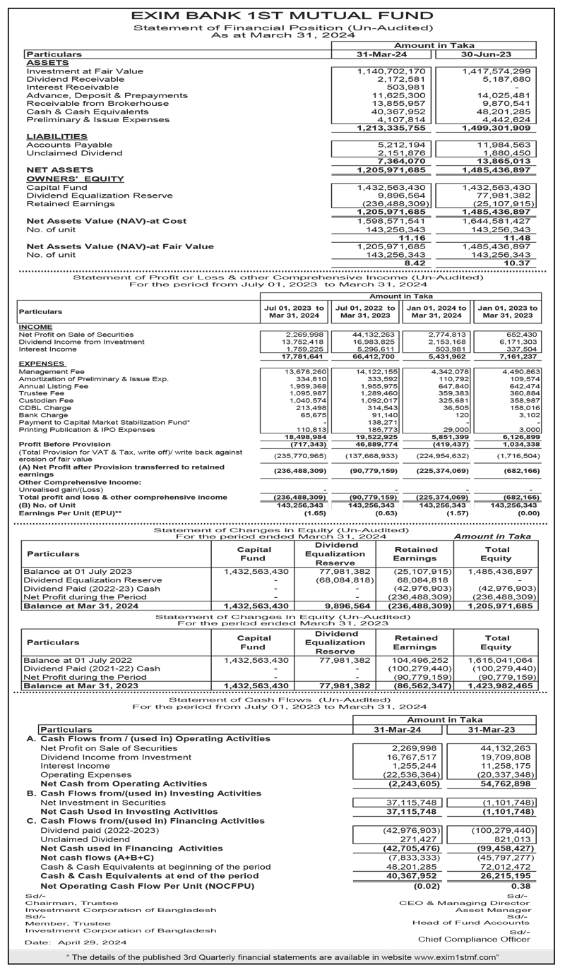 Price Sensitive Information of EXIM Bank 1st Mutual Fund