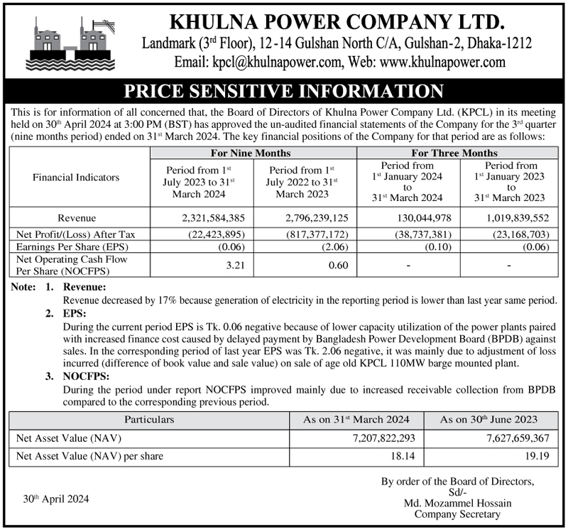 Price Sensitive Information of Khulna Power Company Ltd.