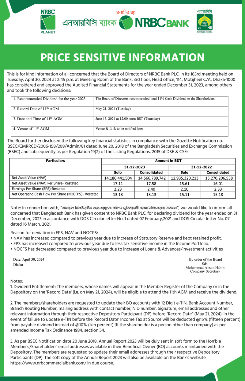 Price Sensitive Information of NRBC Bank PLC