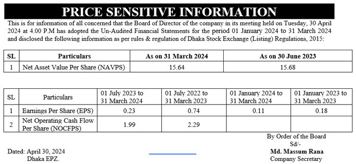 Price Sensitive Information of Queen South Textile Mills Ltd.
