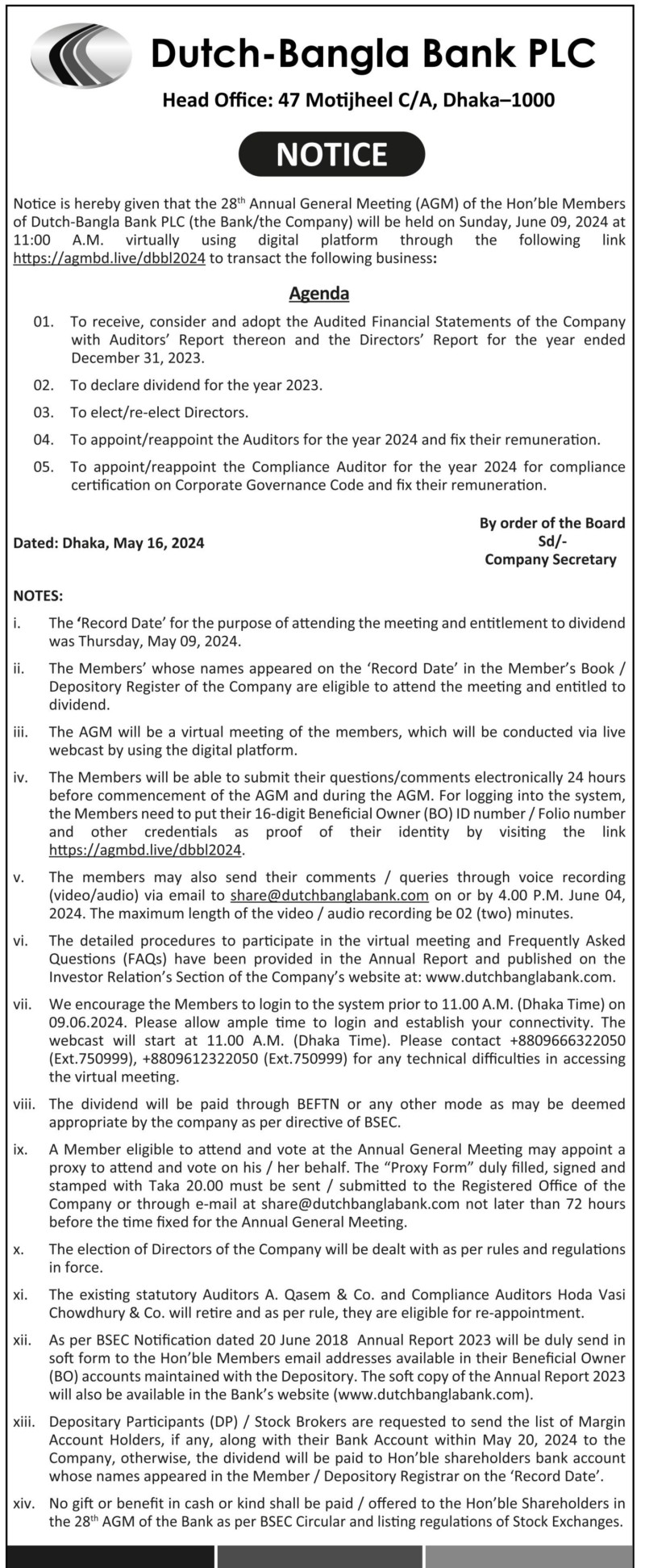 Notice of Dutch-Bangla Bank PLC