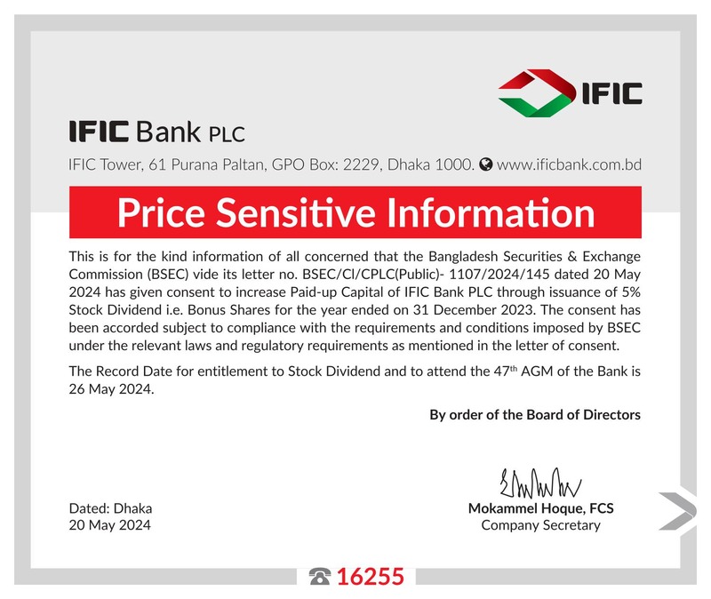 Price Sensitive Information of IFIC Bank PLC