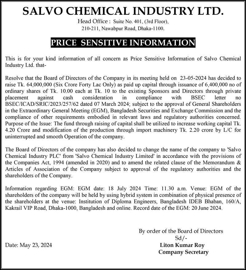 Price Sensitive Information of Salvo Chemical Industry Limited