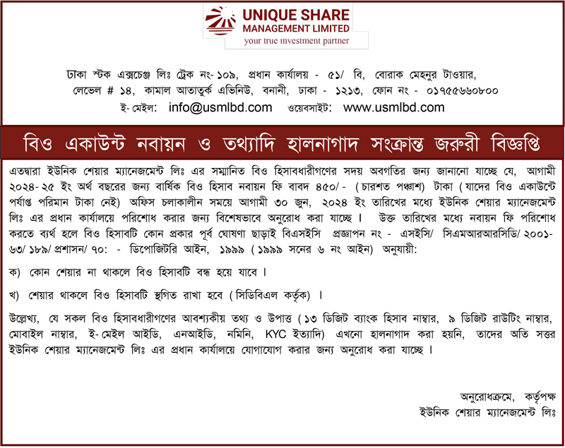 ইউনিক শেয়ার ম্যানেজমেন্ট লিমিটেড এর বিও একাউন্ট নবায়ন সংক্রান্ত জরুরী বিজ্ঞপ্তি