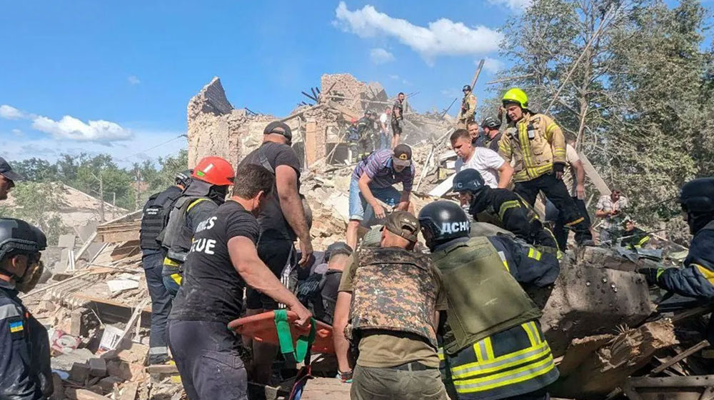 জেলেনস্কির শেয়ার করা ভিডিওতে দেখা যায়, একজনকে স্ট্রেচারে করে ধ্বংসস্তূপ থেকে বের করে আনা হচ্ছে। অগ্নিনির্বাপক কর্মীরা আগুন নেভানোর চেষ্টা করছে এবং উদ্ধারকারীরা ধ্বংসাবশেষের মধ্যে কংক্রিটের একটি ব্লক উত্তোলন করেছে।