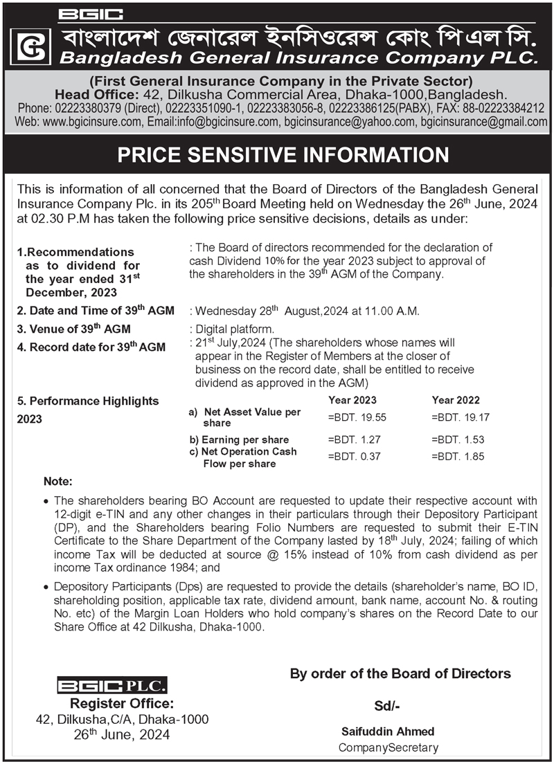 Price Sensitive Information of Bangladesh General Insurance Company PLC