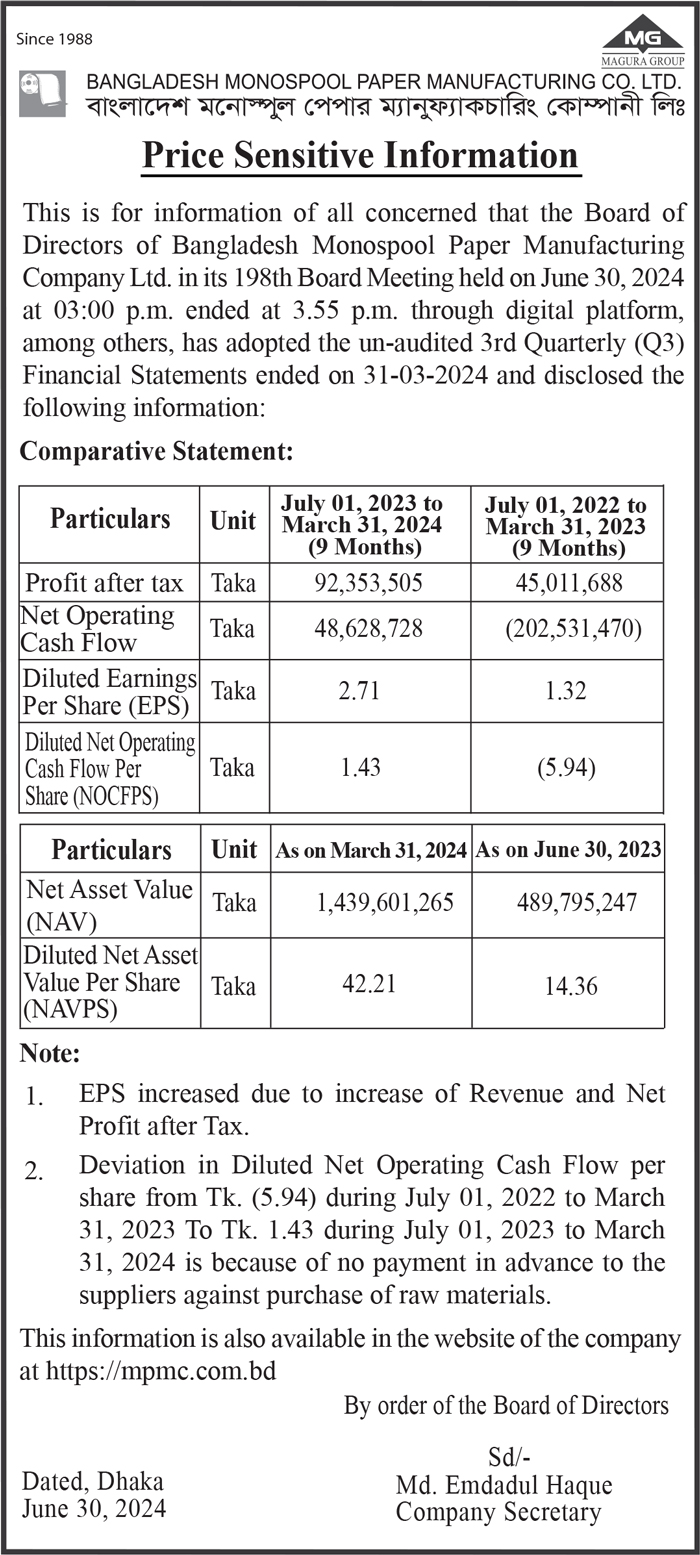 Price Sensitive Information of Bangladesh Monospool Paper Mfg. Co. Ltd.