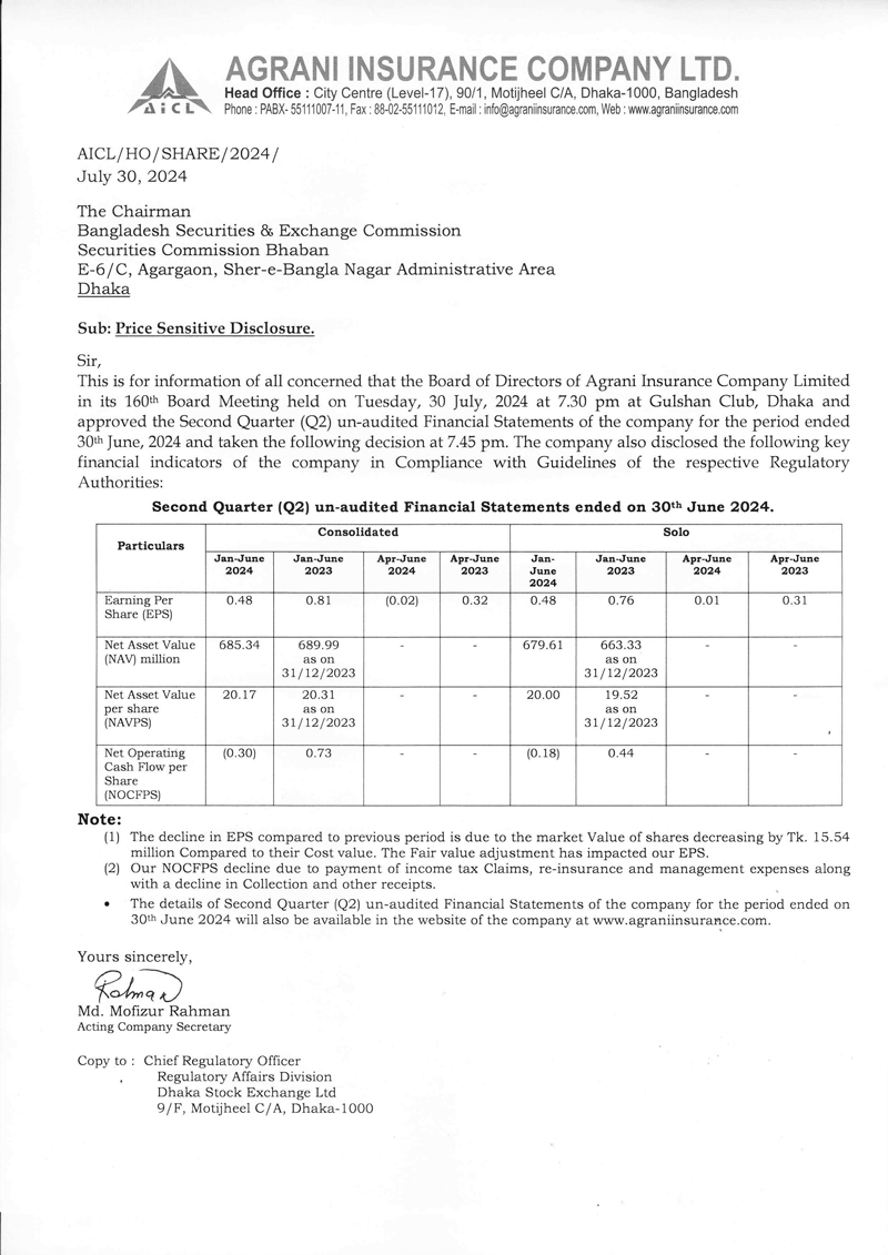 Price Sensitive Information of Agrani Insurance Company Limited