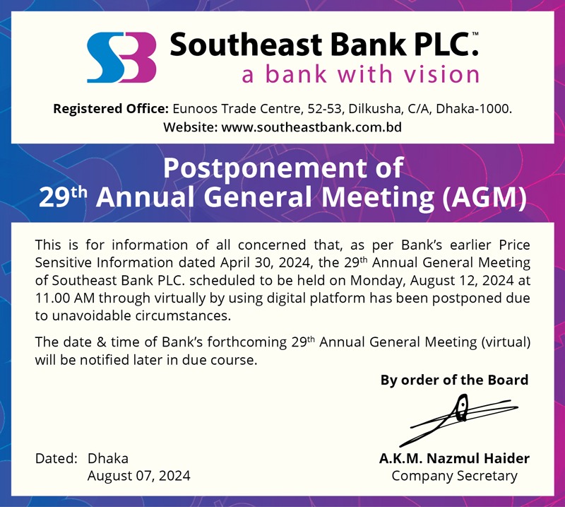 Postponement of 29th AGM of Southeast Bank PLC.