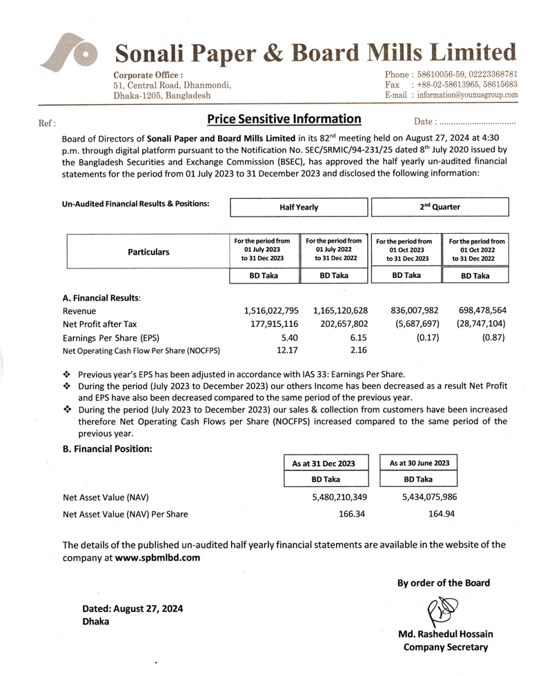 Price Sensitive Information of Sonali Paper & Board Mills Ltd