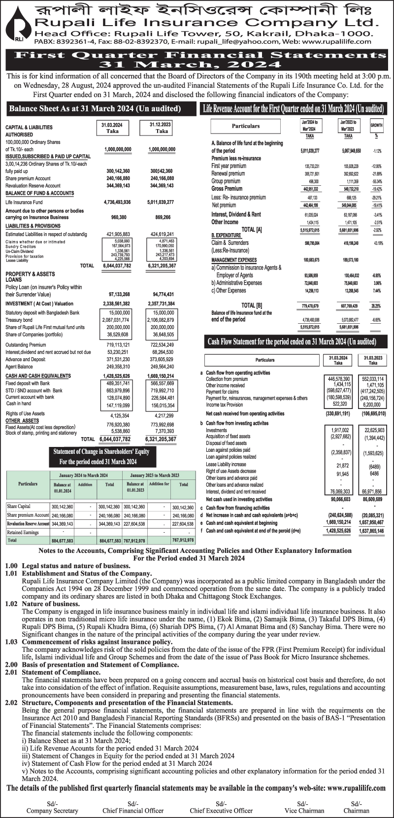 Q1 Financial Statements of Rupali Life Insurance Company Limited