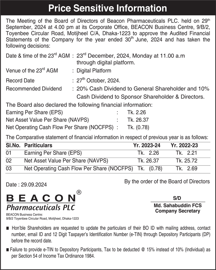 Price Sensitive Information of Beacon Pharmaceuticals PLC