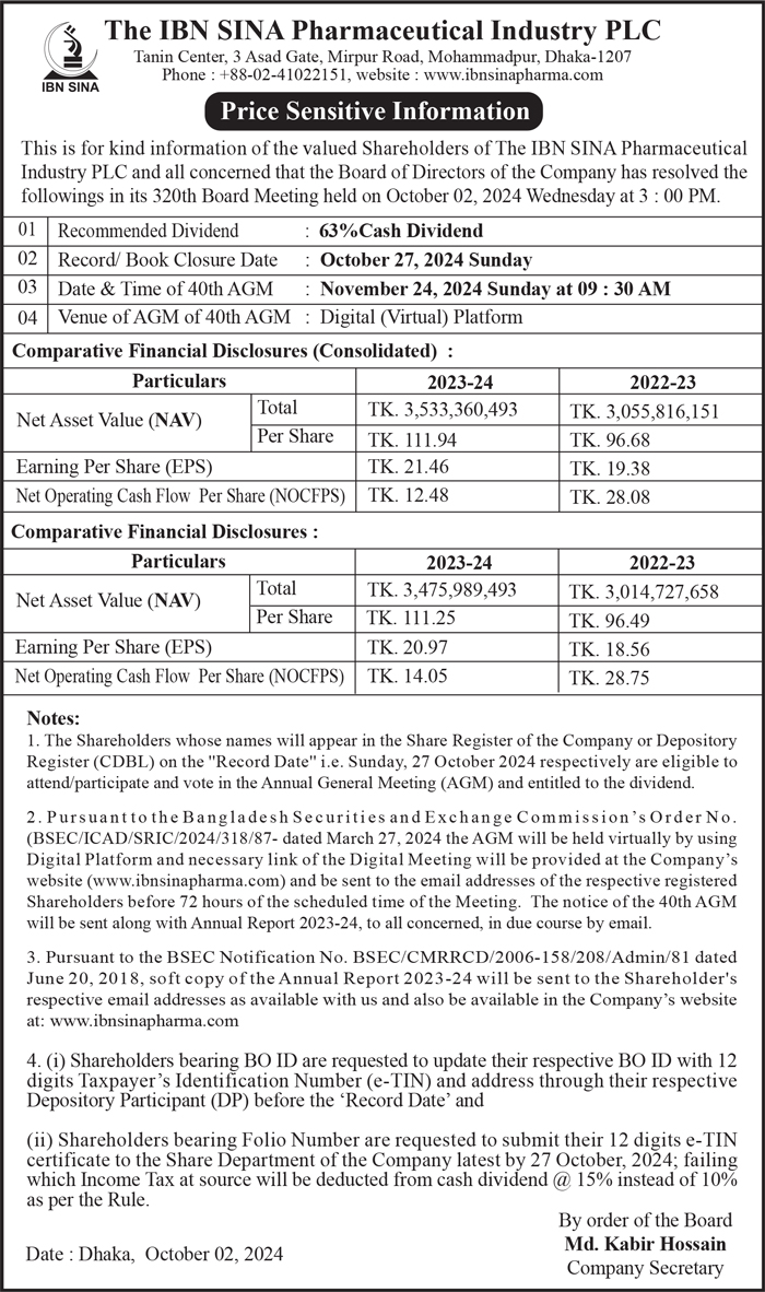 Price Sensitive Information of The IBN SINA Pharmaceutical Industry PLC