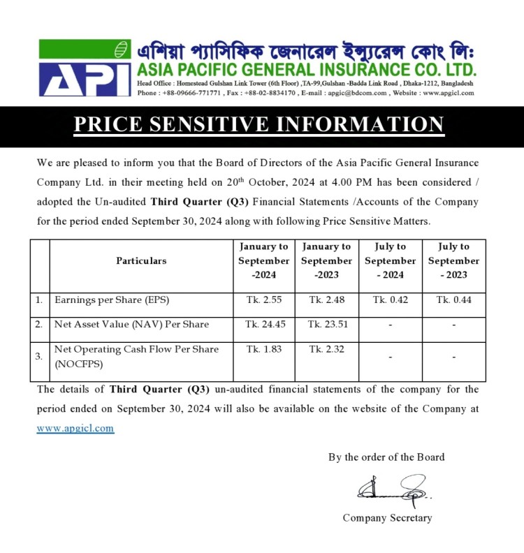 Price Sensitive Information of Asia Pacific General Insurance Company