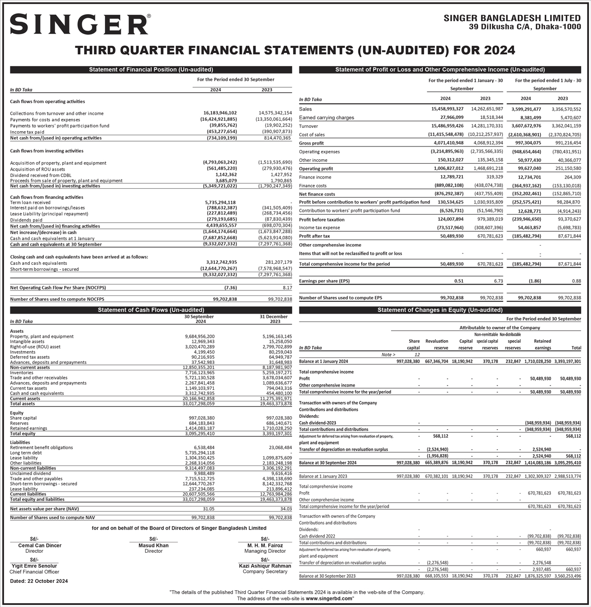 Q3 Financial Statements (Un-audited) of Singer Bangladesh Limited