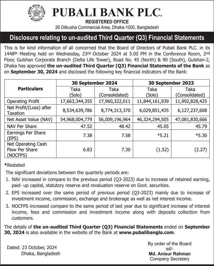 Q3 Un-audited Financial Statements of Pubali Bank PLC