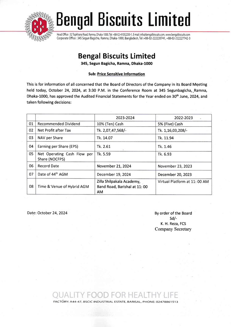 Price Sensitive Information of Bengal Biscuits Limited