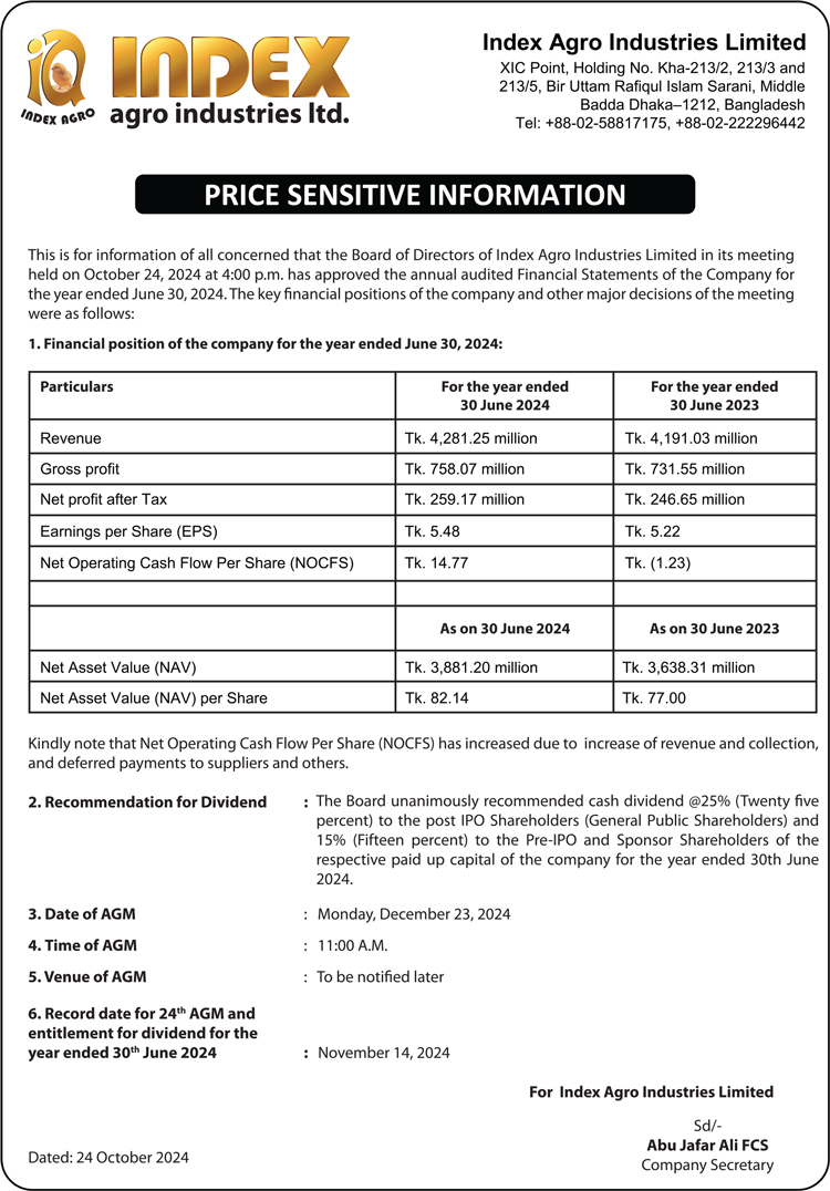 Price Sensitive Information of Index Agro Industries Limited