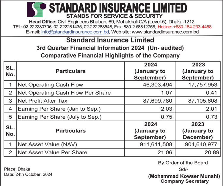Q3 Un-audited Financial Statements of Standard Insurance Limited