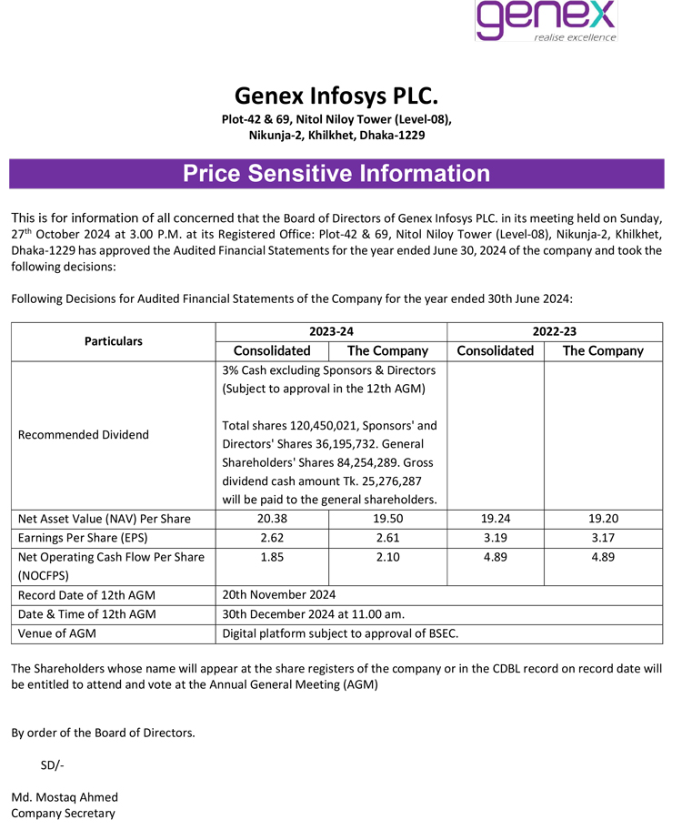 Price Sensitive Information of Genex Infosys Limited