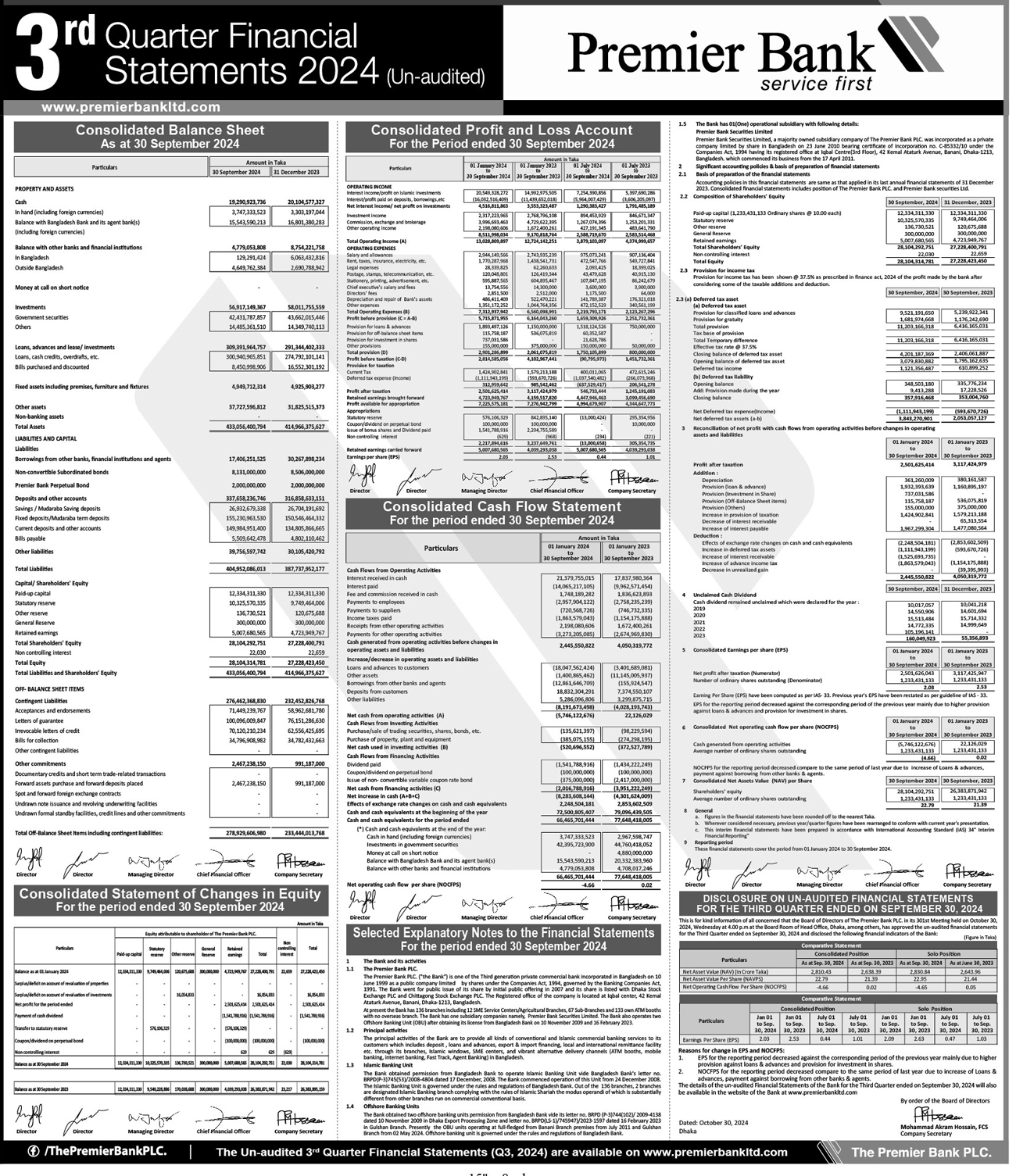 Q3 Un-audited Financial Statements of Premier bank