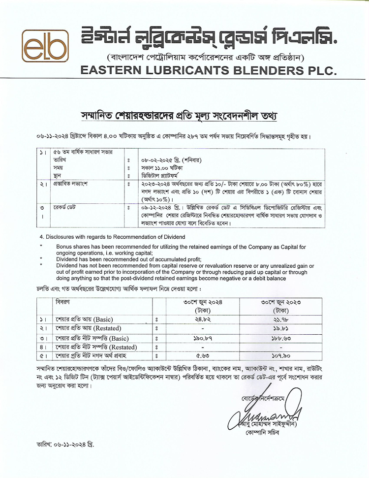 Price Sensitive Information of Eastern Lubricants Blenders PLC