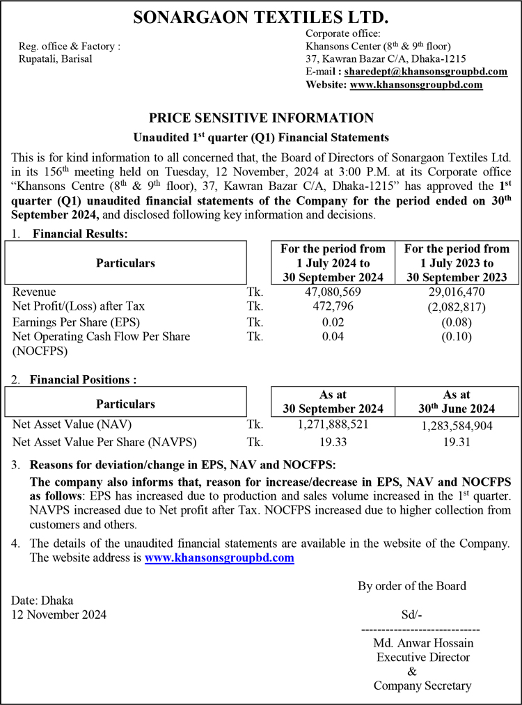 Price Sensitive Information of Sonargaon Textiles Limited