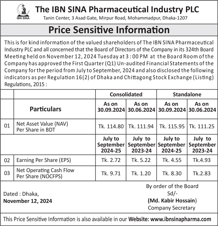 Price Sensitive Information of The IBN SINA Phamaceutical Industry PLC.
