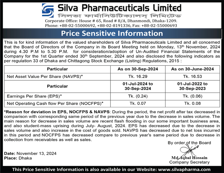 Price Sensitive Information of Silva Pharmaceuticals Limited