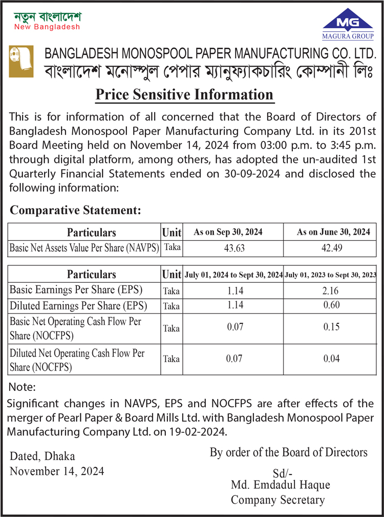 Price Sensitive Information of Bangladesh Monospool Paper Manufacturing Company Limited