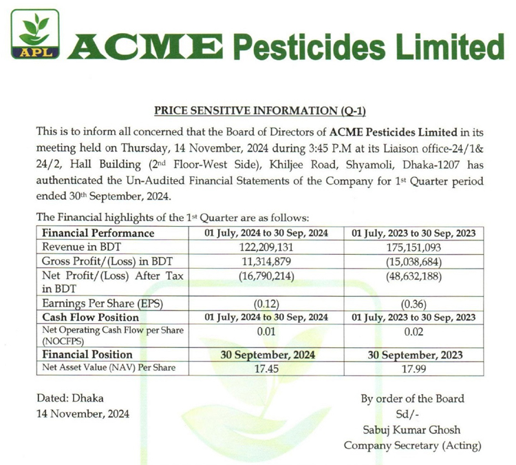 Price Sensitive Information (Q1) of Acme Pesticides Limited