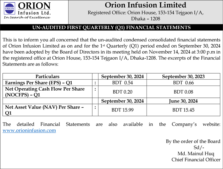 Un-Audited First Quarterly (Q1) Financial Statements of Orion Infusion Limited