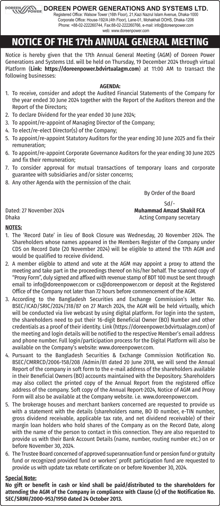 Notice of the 17th AGM of Doreen Power Generations and Systems Limited