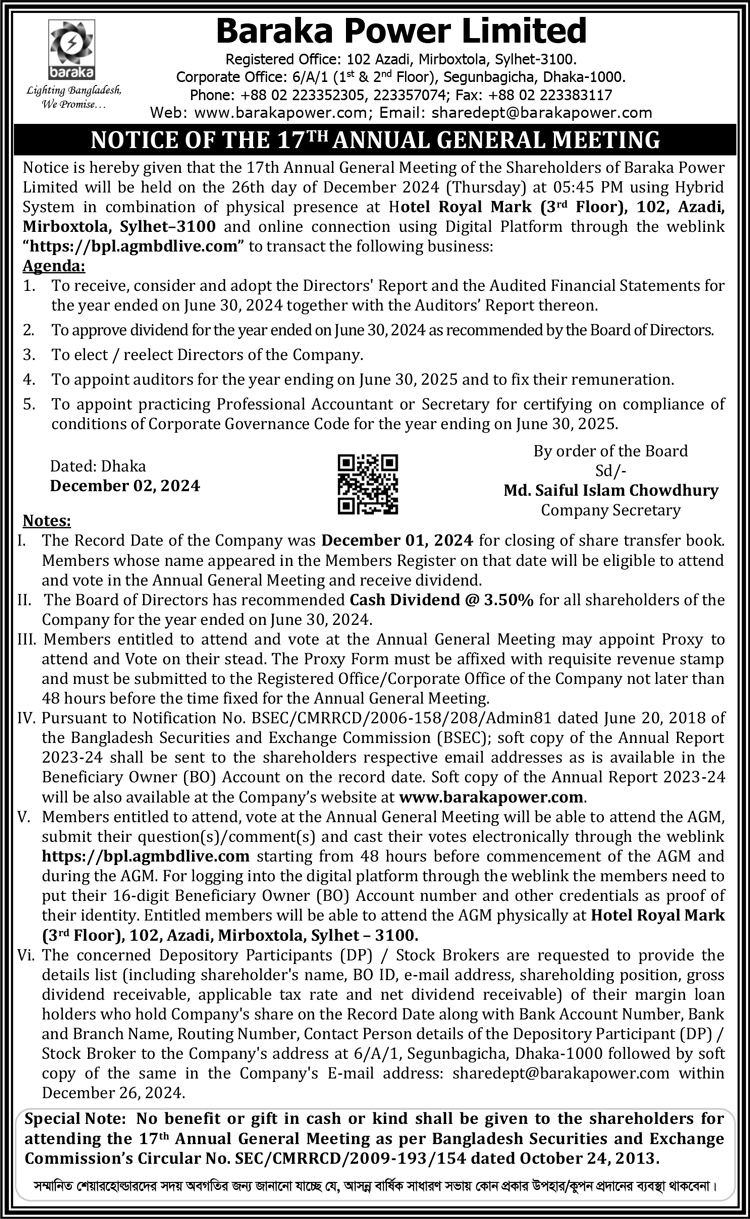 Notice of the 17th AGM of Baraka Power Limtied
