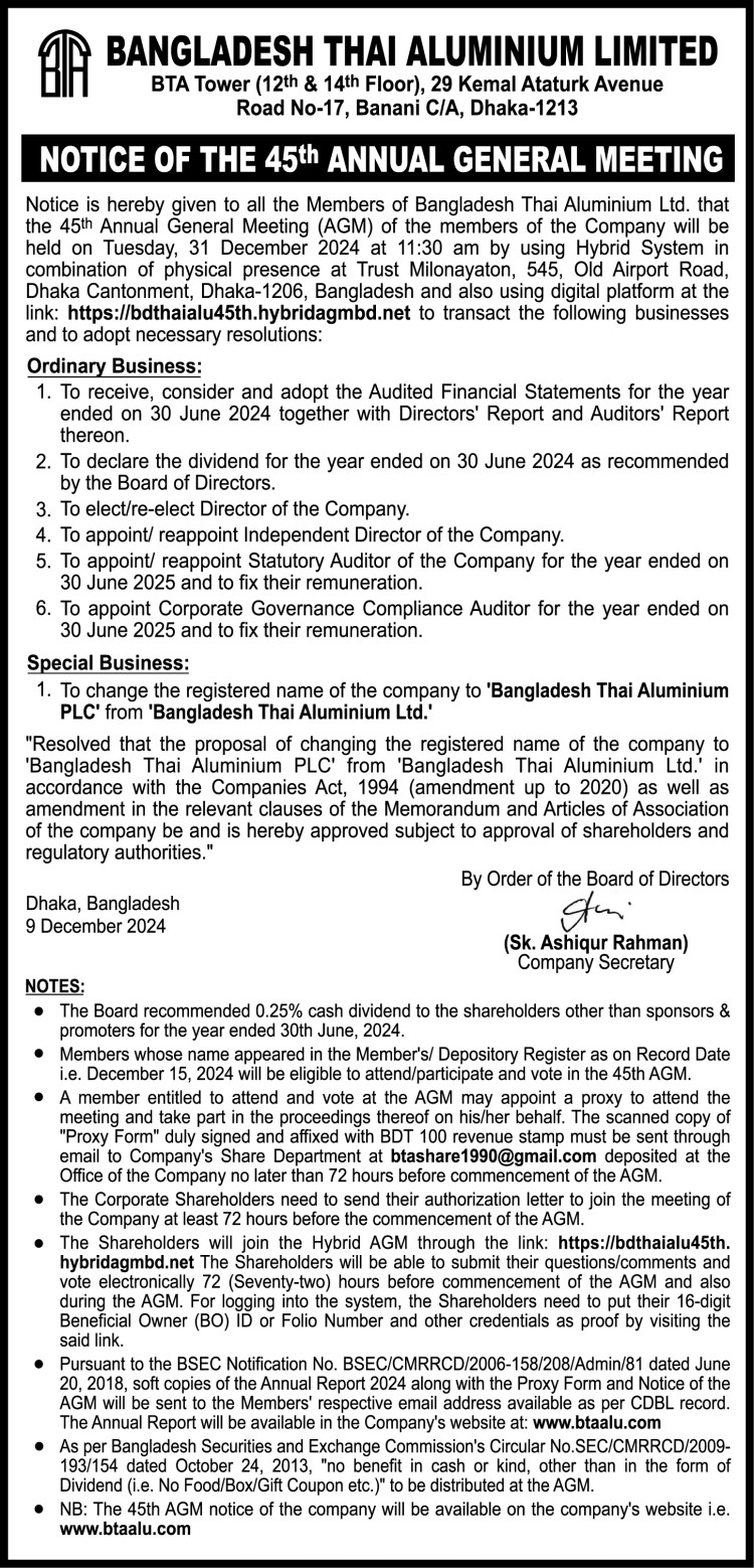 Notice of the 45th AGM of Bangladesh Thai Aluminium Ltd.