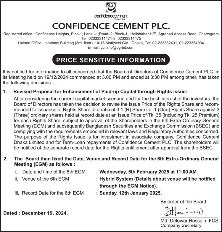 Price Sensitive Information of Confidence Cement PLC.