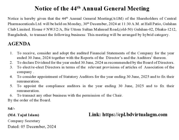 Notice of the 44th AGM of Central Pharmaceuticals Ltd.