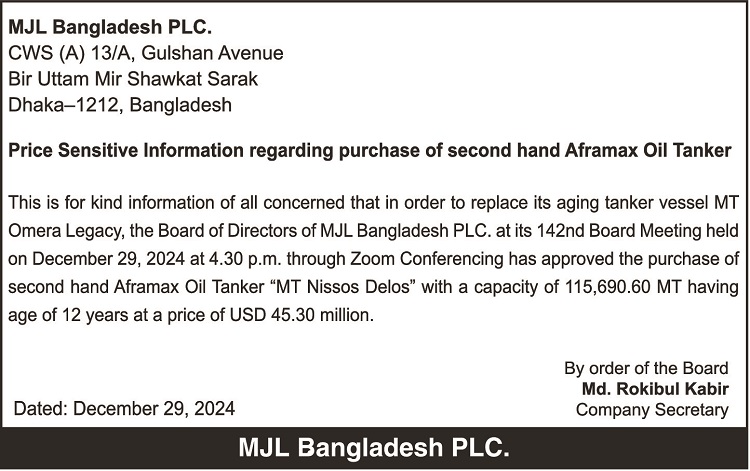 Price Sensitive Information (regarding purchase of 2nd hand Aframax Oil Tanker) of MJL Bangladesh PLC.
