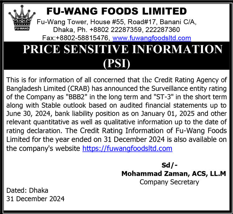 Price Sensitive Information of Fu-Wang Foods Limited