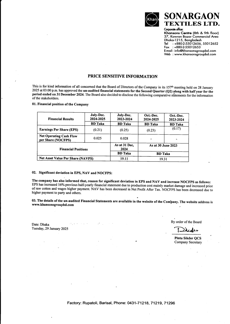 Price Sensitive Information of Sonargaon Textiles Ltd.