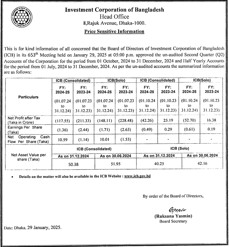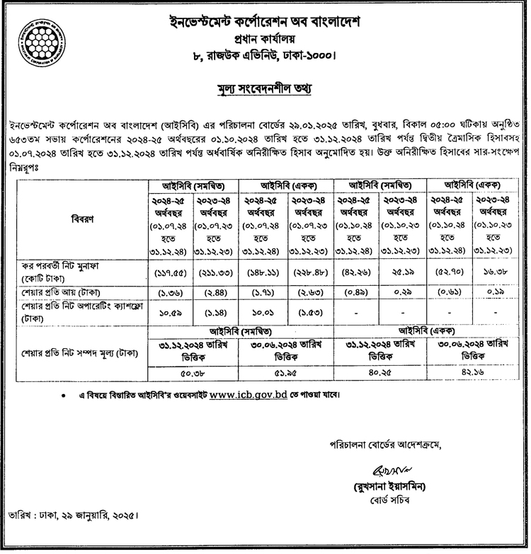 Price Sensitive Information of Investment Corporation of Bangladesh (ICB)